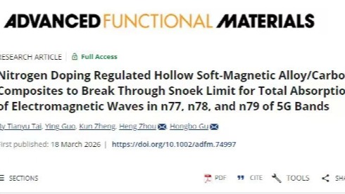 2026.02.26谷红波副教授团队利用氮掺杂调控中空软磁合金/碳复合材料突破Snoek极限,实现对5G频段n77、n78和n79电磁波的全吸收,研究成果发表于《先进功能材料》