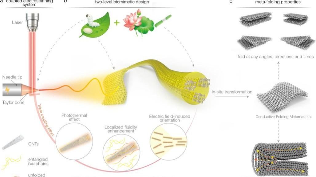 2025.11.10吴彤研究员团队变革百年电纺技术,创建激光诱导仿生方法,实现折叠电子超材料的突破,成果发表于PNAS