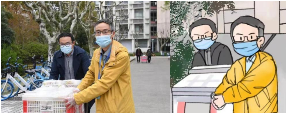 学校转入封闭管理以来,所有的课程转入线上教学,家就在一条马路之隔的对面的朱老师,为了全身心投入工作,站好最后一班岗,他一个多月以来却未曾回家。一个月前,朱老师听闻学院在招募送餐志愿者,他第一时间便报上了名,每天来回学生宿舍与食堂之间两三趟,微信步数早已登顶榜单。每天晚上仍然乐呵呵地在朋友圈里配图发布自己的感言,记录送餐的点点滴滴,他说疫情时期的这份特别记录将成为一段很美好的回忆。