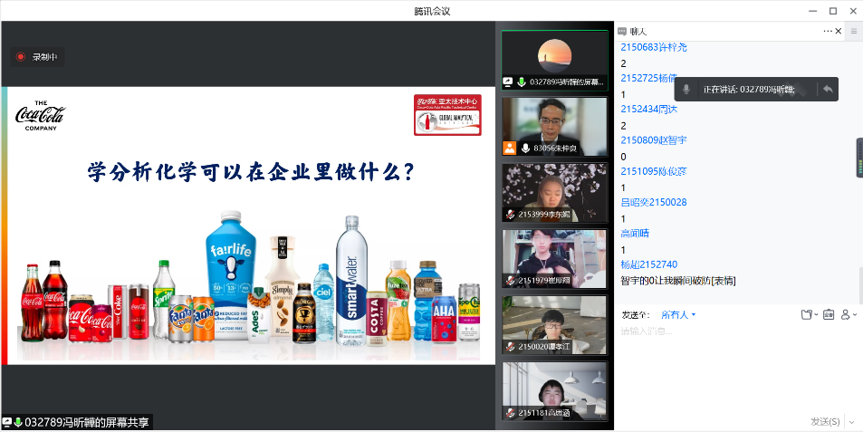2003级本科生,2007级硕士研究生,2010级博士研究生,现供职于可口可乐中国有限公司亚太技术中心的冯昕韡校友向大家介绍了分析化学在企业里的就业前景,以及仪器分析的三个发展方向:“1.分析化学与数据科学的交叉”“2.分析工作的自动化”“3.成像技术的发展”,让同学们切身感受到化学学习与实际生产生活是密不可分的。