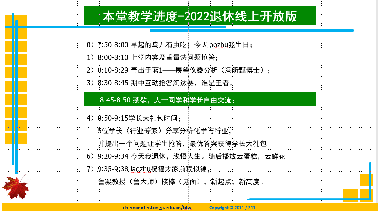4月18日,在朱老师的课程微信群,社交朋友圈热情积极的活动预告中,大家发现了一个别样的缘分:4月19日除了是朱老师教学生涯最后一堂课程时间之外,同样也是他六十岁生日的日子,数不清的“退休快乐”与“生日快乐”美好祝福提前涌现在同济化院师生的社交平台。而为了这堂课能够更好地呈现给同学们,朱老师提前数日便开始精心准备这堂课程,他始终秉承严谨求实的工作态度,时至前夕仍然在熬夜加班来校对课程过程中重要的时间节点以及完善每一个课程细节。