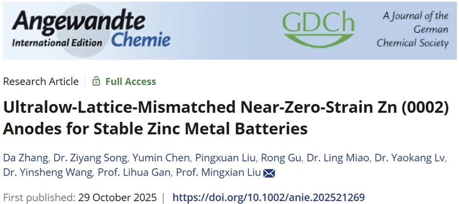 我院刘明贤教授团队长期致力于高效储能材料研究并应用于新能源电池,在设计新型亲质子羰基聚合物(Angew. Chem. Int. Ed., 2025, 64, e202423936)、低氧化还原势垒双电子p型有机材料(Angew. Chem. Int. Ed., 2025, 64, e202501278)、多氮杂环给体-受体自组装有机超结构(Angew. Chem. Int. Ed., 2025, 64, e202418237)、多重氢键自组装超结构(Energy Environ. Sci., 2025, 18, 5397–5406)、高转化效率和稳定六电子碘转化设计(Energy Environ. Sci., 2025, 18, 6540–6547)等方面取得了一系列重要研究成果。在研究团队前期单一Zn (0002)晶面暴露(Angew. Chem. Int. Ed., 2025, 64, e202414116, Hot Paper)和低应力介导Zn (0002)晶面暴露(Angew. Chem. Int. Ed., 2025, 64, e202500380)研究基础上,近期设计了一种超低晶格失配的铝硅合金基底(Al-0.1wt%Si),制备出近乎零应力的锌金属负极,实现了锌金属电池的高度可逆性和稳定性,研究成果以"Ultralow-Lattice-Mismatched Near-Zero-Strain Zn (0002) Anodes for Stable Zinc Metal Batteries"为题发表于国际化学领域权威期刊《德国应用化学》(Angewandte Chemie International Edition),并被编辑遴选为热点论文(Hot Paper)。