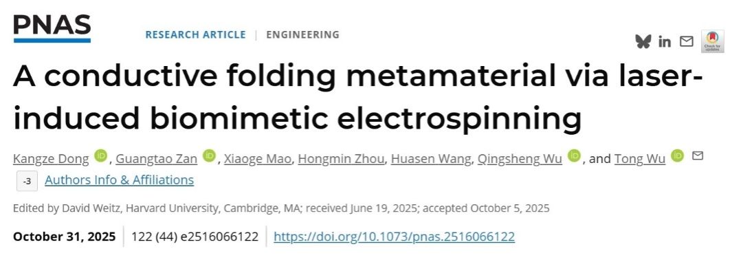 超材料(metamaterial)是一类通过人工结构设计、实现自然界不存在的超常物理性质的人造复合材料,而且它们的这种特性均源自于其精巧设计的微观结构,而非材料本身的化学组成。“超材料”的概念最早产生于上世纪60年代,但受限于当时的制备技术,该理论沉寂了三十多年,直到世纪之交才首次实现其实验室制备,诞生了世界第一个超材料:负折射超材料。此后,隐身斗篷、光子晶体、负泊松比等十多种性能各异的超材料被陆续发明。由于超材料具有一些独特的性质和异乎寻常的应用场景,故被Science杂志评为21世纪影响人类的十大科技突破之一,并且成为近几年的诺贝尔奖风向标。然而,至今却仍未在“导电折叠超材料(CFMs)”方面获得突破。其主要原因在于,本征导电材料不可(真)折叠属性以及材料的折叠与导电相互矛盾本质,以至于尚没有一种合适的方法来设计制备它。为此,WilliamHill中文吴彤研究员领衔的纳米化学科研团队通过创建“激光-静电场耦合仿生纺丝(LECBS)”技术破解了这一难题。研究成果以“A conductive folding metamaterial via laser- induced biomimetic electrospinning”为题发表于国际顶级综合性学术期刊PNAS(Proceedings of the National Academy of Sciences of the United States of America)即《美国国家科学院院刊》。