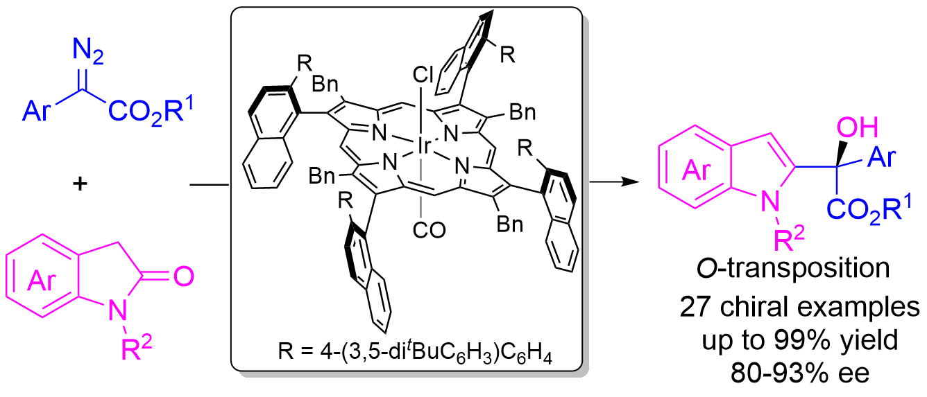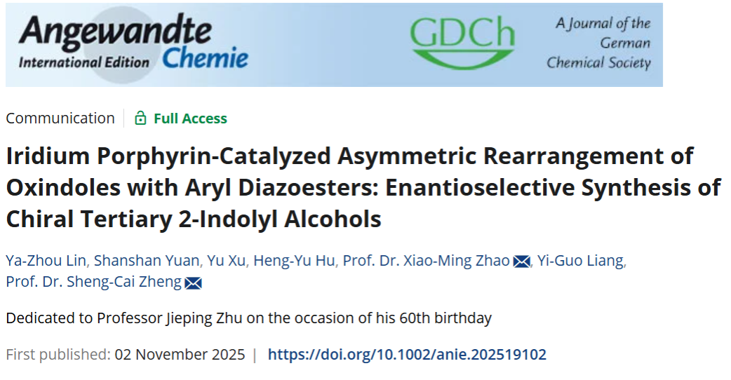 吲哚衍生物作为天然产物和药物分子中的重要骨架,其C2位不对称功能化一直是有机合成中的难点。传统方法主要依赖C3位亲核性进行Friedel-Crafts反应,而C2位功能化往往需要预官能团化或使用还原型吲哚。卡宾化学中的羰基叶立德重排反应为吲哚C2位功能化提供了新思路,但手性控制面临叶立德易解离导致对映选择性降低的挑战。WilliamHill中文郑生财/赵晓明团队基于前期β-芳基轴手性铱卟啉催化剂的研究基础(Angew. Chem. Int. Ed. 2024, 63, e202404329;J. Am. Chem. Soc. 2025, 147, 51.; Chem Catal. 2025, 5, 101262.),开发了氧化吲哚与芳基重氮酯的不对称重排新策略, 为手性2-吲哚叔醇的合成提供了高效方法。相关研究成果“Iridium Porphyrin-Catalyzed Asymmetric Rearrangement of Oxindoles with Aryl Diazoesters: Enantioselective Synthesis of Chiral Tertiary 2-Indolyl Alcohols”在线发表于国际知名期刊《德国应用化学》(Angew. Chem. Int. Ed.)。