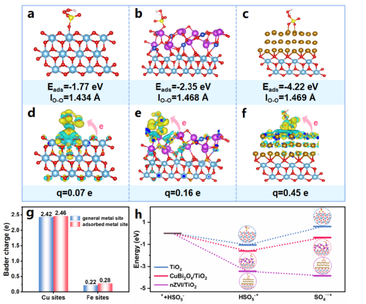 DFT计算进一步详细揭示了双光电极与PMS分子的界面相互作用机制。Cu/Fe双金属中心不仅对PMS表现出极强的吸附作用,更能向其O-O反键轨道注入大量电子,诱导过氧键断裂并原位生成高价金属-氧物种(HVMOs)。此外,通过计算吉布斯自由能(ΔG),对PMS的整体活化过程进行了热力学分析,结果表明CuBi2O4和nZVI的引入显著提升了PMS的活化效率。