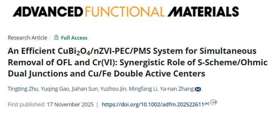 william威廉中文长聘副教授张亚男长期致力于复杂水体污染物的高效去除相关研究。研究团队近期采用“S型/欧姆双异质结”与“Cu/Fe双金属中心”协同策略,成功制备了先进的CuBi2O4/TiO2光阳极和nZVI/TiO2光阴极,并通过光电催化(PEC)耦合过氧单硫酸盐(PMS),构建了高效的CuBi2O4/nZVI-PEC/PMS体系,实现了对OFL和Cr(VI)的高效同步去除。相关研究成果以“An efficient CuBi2O4/nZVI-PEC/PMS system for simultaneous removal of OFL and Cr(VI): Synergistic role of S-Scheme/Ohmic dual junctions and Cu/Fe double active centers”为题发表于国际知名期刊《先进功能材料》(Advanced Functional Materials)。