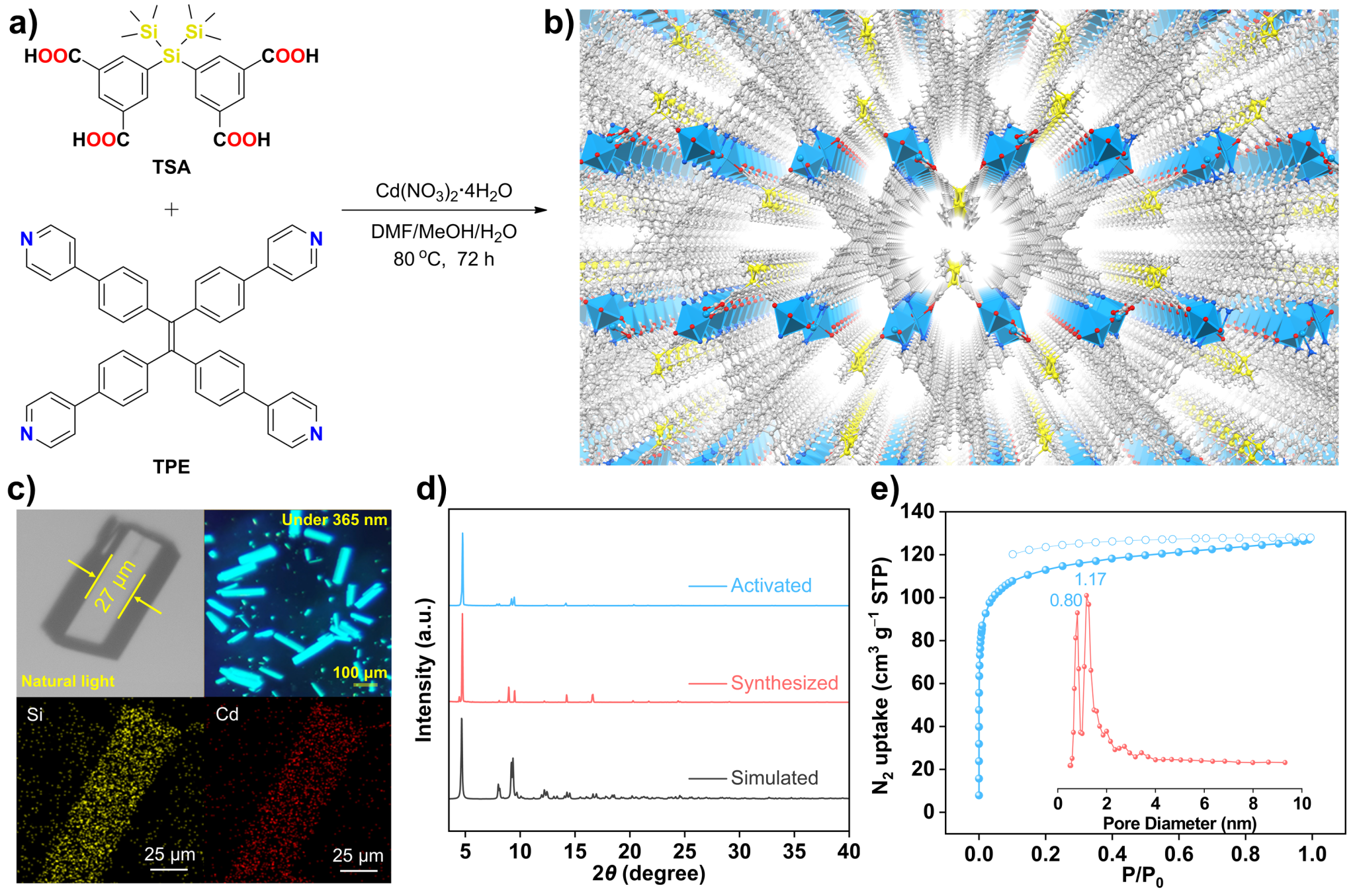该研究成功制备了具有三连硅基孔道修饰的MOF晶体SiTPE。三连硅官能团不仅增强了材料的疏水性,促进硝基化合物的预富集,还通过独特的三连硅基团—硝基相互作用构建了疏水“纳米陷阱”,与框架中聚集诱导发光(AIE)单元TPE协同作用,实现对痕量硝基化合物的高效荧光猝灭。