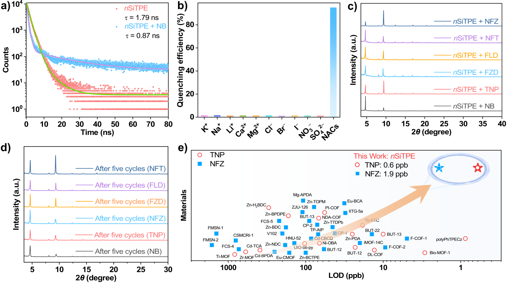 机理研究阐明了MOF孔道表面的三连硅基团具有疏水作用以及与硝基的弱相互作用(如C–H···O–N),显著提升了对水相中超低浓度硝基化合的富集和吸附能力,进而通过光诱导电子转移(PET)机制高效猝灭了TPE单元的荧光,从而实现超高灵敏度检测。该研究不仅为环境中痕量硝基污染物的检测提供了新一代高性能传感平台,也为功能性MOF材料的结构设计与智能传感系统集成提供了新思路。