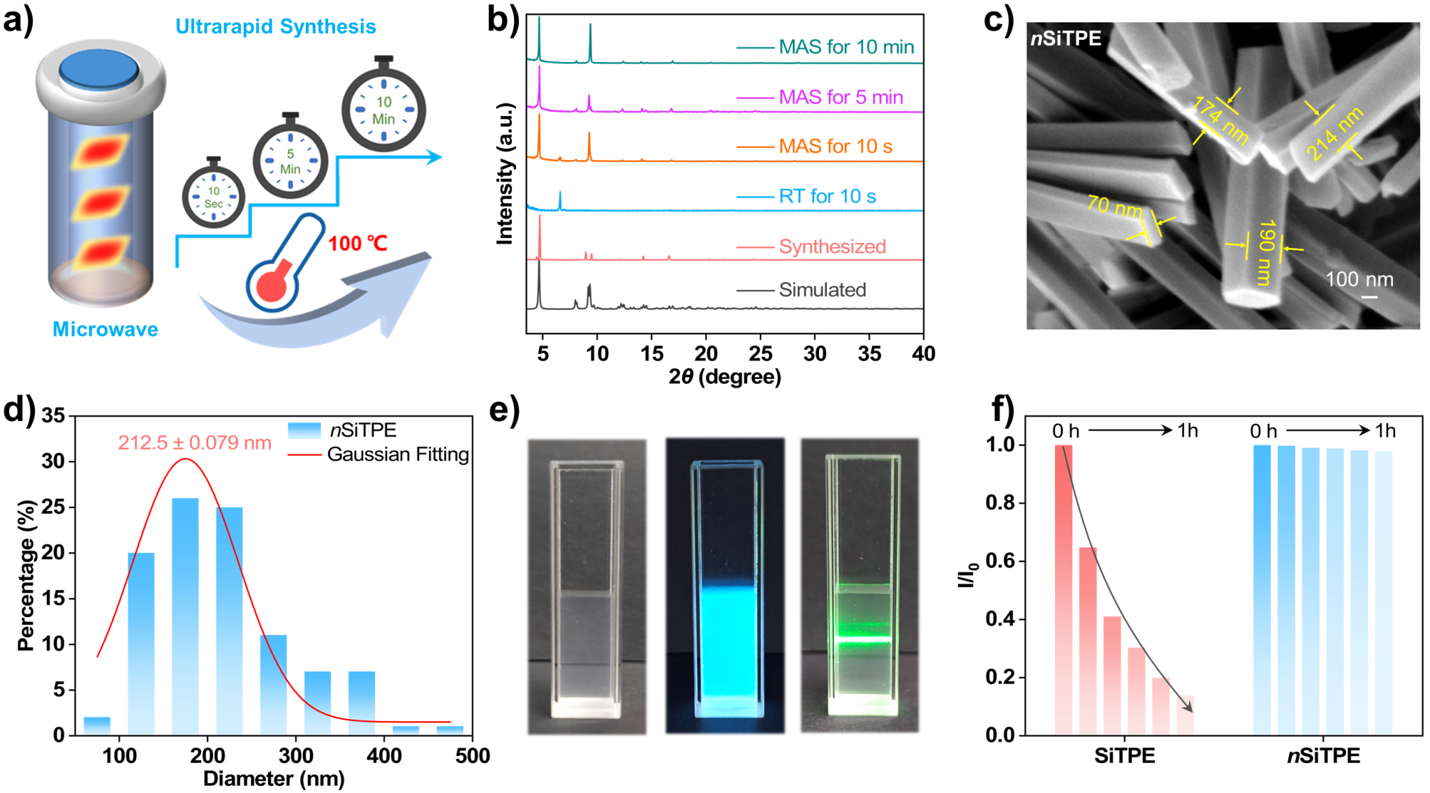 该研究还发展了微波辅助的合成方法,可在秒级时间内制备出尺寸均一、分散性良好的MOF微纳晶体(nSiTPE),其在水相中表现出优异的分散稳定性与显著的荧光响应,从而大幅提升了检测灵敏度与响应速度。