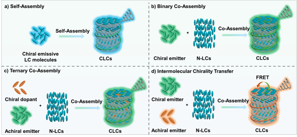 圆偏振发光(Circularly Polarized Luminescence, CPL)材料因其能够直接发射具有特定手性的圆偏振光,在三维显示、手性光催化、光学传感、可调谐激光器、信息存储与加密等前沿领域展现出广阔的应用前景,已成为手性光子学与先进光学材料研究的热点方向。然而,如何实现高发光不对称因子(glum)的CPL材料,仍是当前该领域面临的核心挑战之一。胆甾相液晶(Cholesteric Liquid Crystal, CLC)组装体系凭借其独特的周期性螺旋超结构和优异的自组装能力,为突破这一关键科学难题提供了极具前景的研究平台。依托该体系,有望实现高性能、动态可调CPL材料的精准构筑与深入开发。鉴于此,基于前期工作基础及相关领域最新进展,刘国锋研究员课题组在《Advanced Functional Materials》上发表了题为“Dynamic Modulation of Circularly Polarized Luminescence in Cholesteric Liquid Crystal Systems: Mechanisms, Strategies, and Beyond”的综述文章。