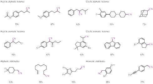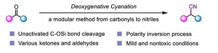 该方法通过使用市售易得的TMSCN对羰基进行加成,随后利用NbCl₅强路易斯酸性和亲氧性促进C-OSi键的断裂及极性反转,从而解决了传统方法针对惰性的高稳定型C-O键时的失活问题,具有广谱的底物兼容性,能够适用于各类脂肪类及芳香类的醛、酮化合物。