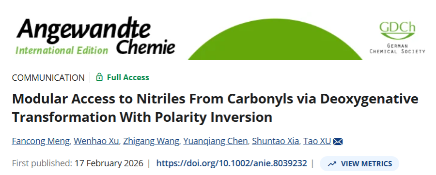 该工作是徐涛课题组在羰基去氧双官能团化(DODC)研究领域的又一重要突破,为腈类分子的合成开辟了全新的方法。更多信息请参阅徐涛课题组:https://taoxu.tongji.edu.cn