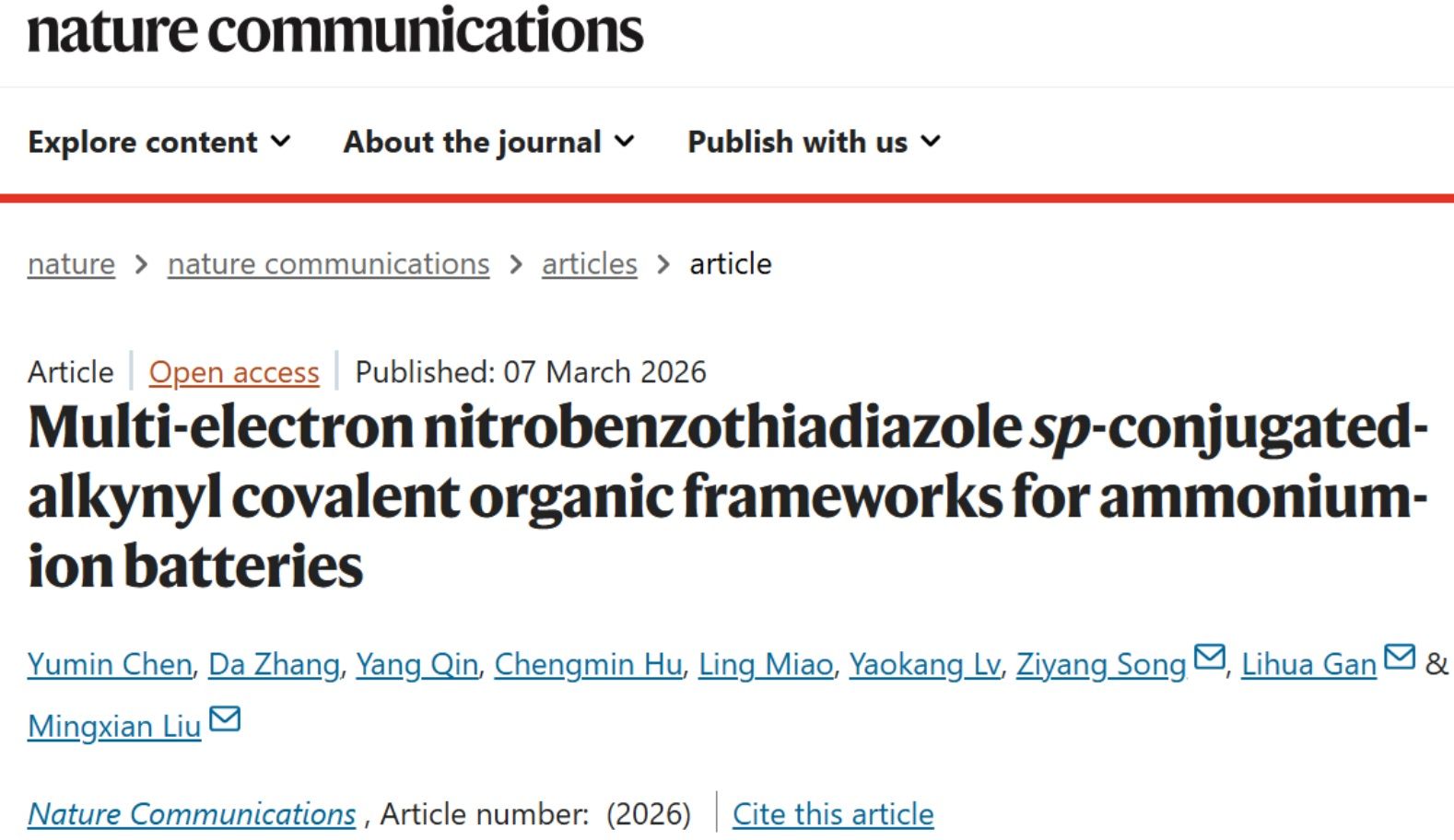 我院甘礼华教授、刘明贤教授团队长期致力于高效储能材料研究并应用于新能源电池,课题组近期设计了多电子硝基苯并噻二唑共价有机框架,促进快速稳定的NH4+氢键配位,揭示了硝基/噻唑双活性中心多电子氧化还原电荷存储机制,有效解决了单电子储能容量低和结构不稳定的问题,构建了高能量密度和超长循环寿命的铵离子电池。相关研究成果以Multi-electron nitrobenzothiadiazole sp-conjugated-alkynyl covalent organic frameworks for ammonium-ion batteries为题,近日在线发表于《自然·通讯》(Nature Communications)。