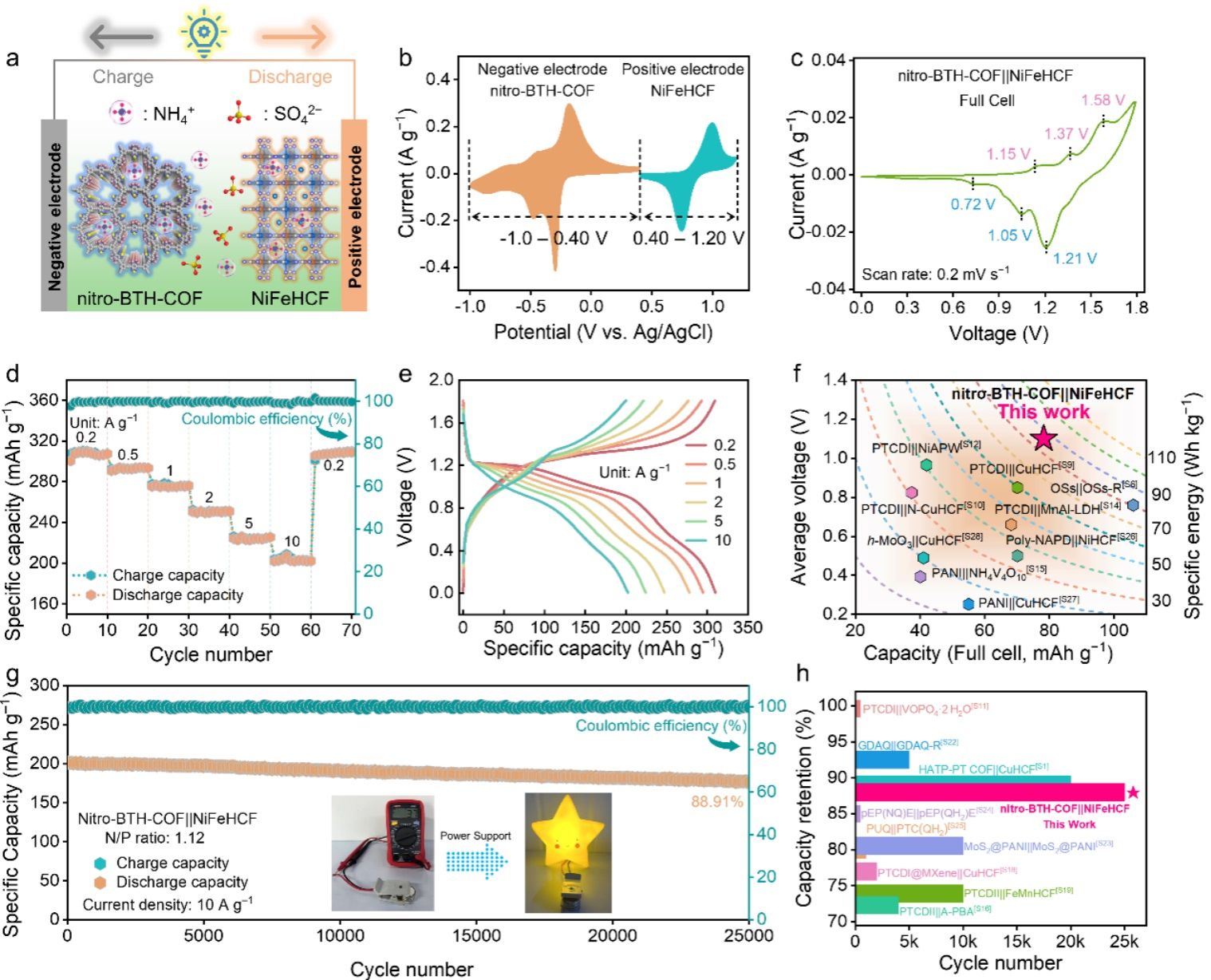 以nitro-BTH-COF为负极,高电压普鲁士蓝类似物(NiFeHCF)为正极构建了铵离子全电池,实现了高能量密度(86.1 Wh kg−1)和长循环寿命(25,000次充放电循环后容量保持率为88.91%)。该工作为通过多电子硝基功能化与sp共轭结构协同设计共价有机框架,构筑高性能、长寿命铵离子电池负极材料提供了新的视角。