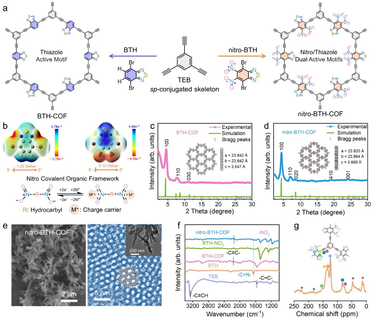 通过引入强吸电子的硝基苯并噻二唑活性单元与高导电性的炔键桥联结构,形成硝基苯并噻二唑共价有机框架(nitro-BTH-COF),高密度硝基/噻唑活性位点和高度离域π-共轭体系,确保了多重双电子硝基/噻唑位点具有高NH4+可及性(利用率达95.2%)和低活化能(25.93 kJ mol−1)。