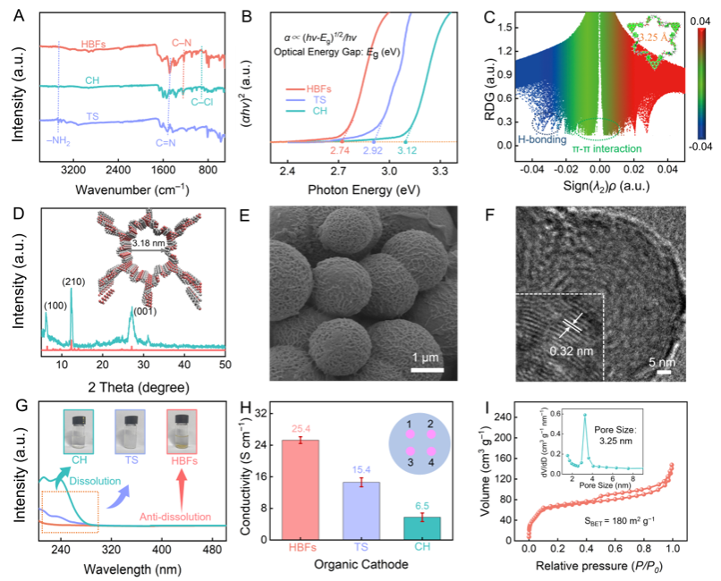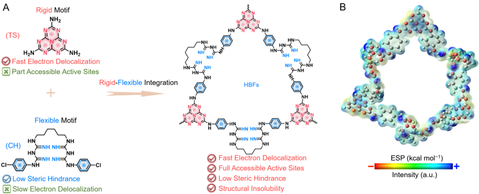 通过整合平面型三电子受体三聚氰酰胺与可旋转四电子受体氯己定连接单元,设计合成了刚柔共济的七嗪-双胍聚合物框架(HBFs),展示出高密度亚胺活性位点和高度共轭结晶结构,低能带间隙和高电导率有助于加快电子转移动力学和电极的氧化还原反应。