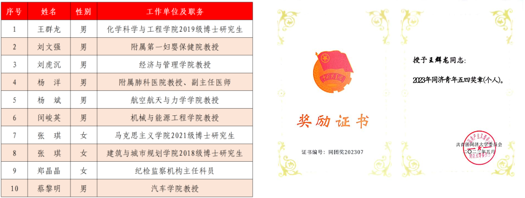 根据《关于开展2023年同济青年五四奖章评选的通知》的要求,在各单位推荐、评审委员会评审的基础上,2023年同济青年五四奖章(个人)获奖者及(集体)获奖单位名单公布。我院2019级博士研究生王群龙获评2023年同济青年五四奖章(个人)。5月4日,王群龙获颁2023年同济青年五四奖章证书。